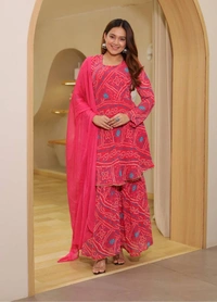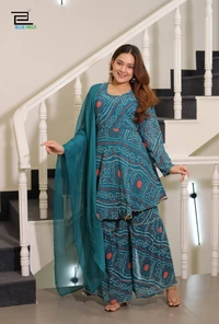 Step into the festival season with unparalleled elegance and charm! The Beautiful Ready-to-Wear Party Wear Sharara Suit is designed to make you stand out at every celebration. With its striking combination of style, comfort, and sophistication, this ensemble is perfect for parties, festivities, and any special occasions.